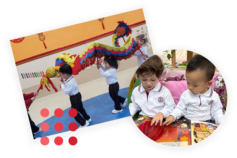 The children continue to develop their speaking and listening skills through the introduction of single words, short phrases and simple sentences. The use of simple rhymes and songs enhance the learning experience and link to thematic learning experiences and cultural integration e.g. Mid-Autumn Festival celebrations, Chinese New Year etc.